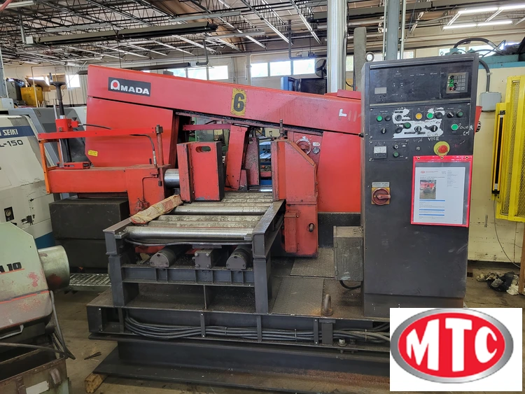 Amada Model HKA-800 Horizontal Column type, true horizontal Automatic bandsaw, with 80" Infeed travel in a single stroke, Bunding attachments on all three vises, 1, 1/2" Blade, variable speed