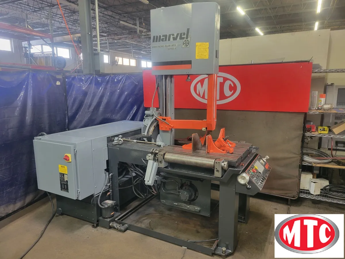 Semi-Automatic Vertical mitering bandsaw, Armstrong-Blum/Marvel Amada Semi-automatic vertical mitering bandsaw legendary Marvel quality, hydraulic drive, HIGH Column 25" Height 20" Throat, power tilt, guide arm, lift rollers and vise